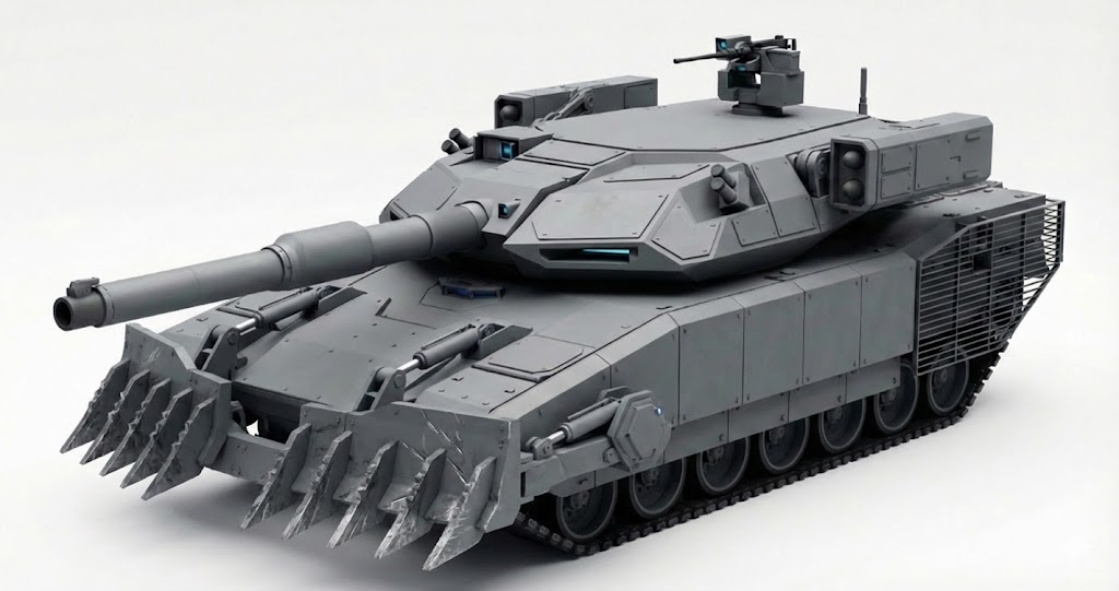 В отличие от предыдущей работы, перед нами полностью вымышленный основной боевой танк, созданный автором с нуля. Его «история» — это продуманная легенда, объясняющая появление машины.
